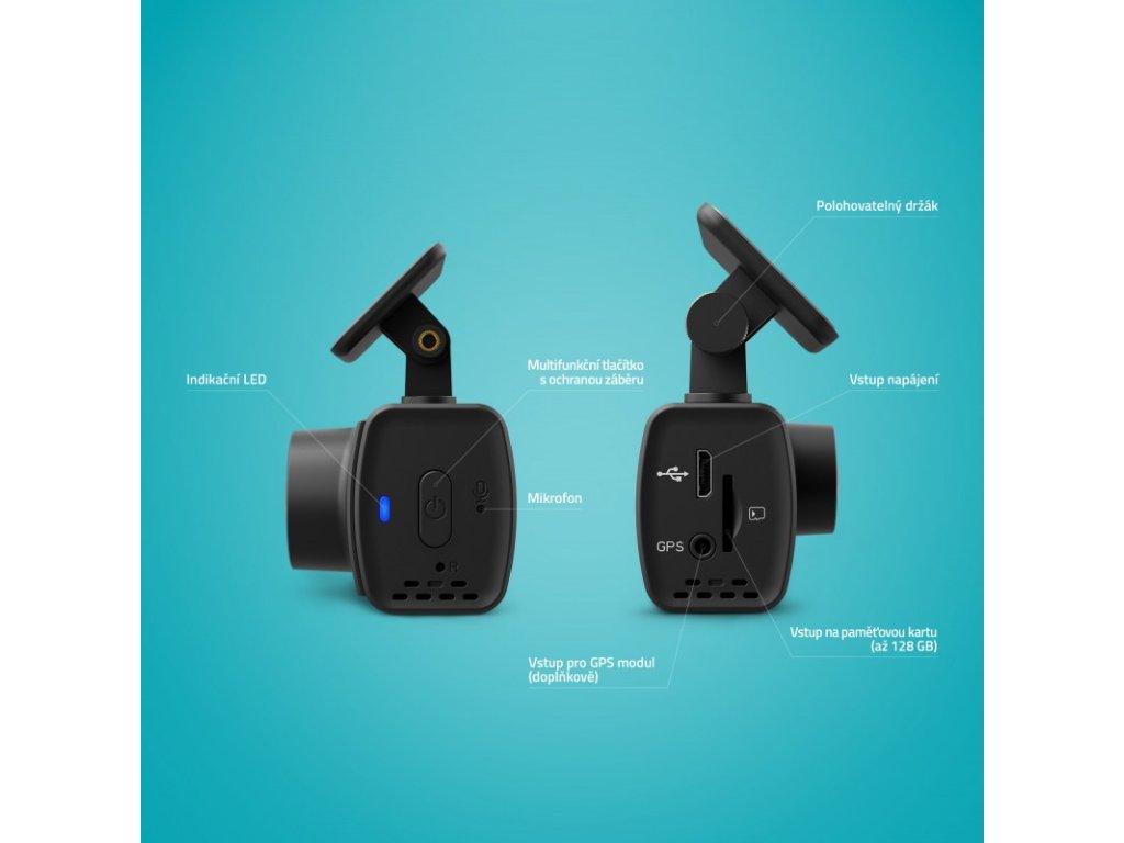 Kamera do auta s nativním Full HD/30fps, Wi-Fi, mobilní aplikace, originální nenápadný design, superkondenzátor, podpora H.265, automatické zapnutí a nahrávání do smyčky, zabudovaný mikrofon, až 128GB paměťová karta.